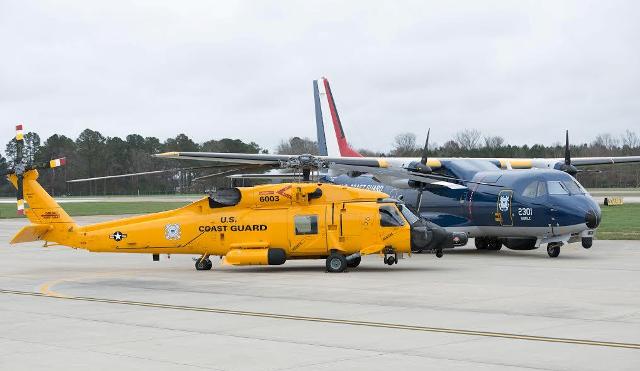 3- Los dos primeros aparatos que el USCG pinta con decoración retro, el citado helicóptero Jayhawk pintado de amarillo, detrás se puede ver el HC-144A.