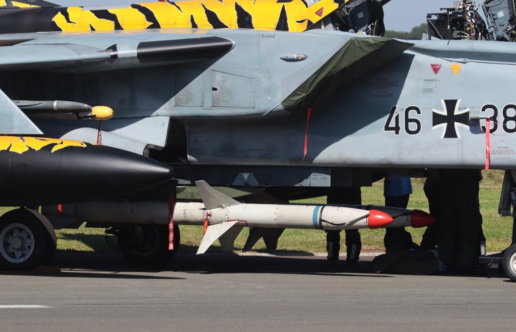 Detalle de los dos misiles HARM AGM-88, que emplean los Tornados para sus misiones SEAD. (foto Julio Maíz Gutiérrez)