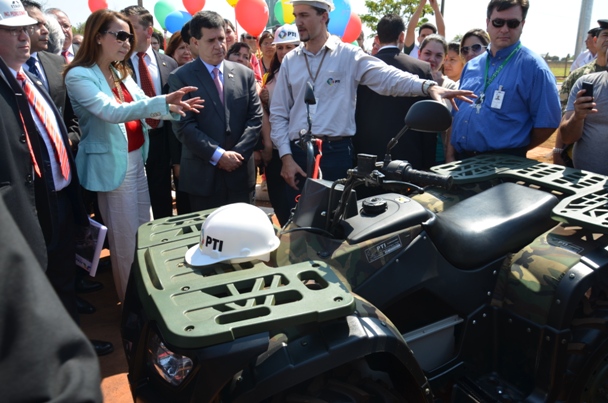(defensa.com) Durante su visita a la Costanera de la Ciudad de Hernandarias (Departamento de Alto Paraná), cuya primera parte fue habilitada, el Presidente paraguayo, Horacio Cartes, conoció los cuaciclones y moto eléctricas que, montadas en el Parque Tecnológico Itaipú (PTI), serán utilizadas como vehículos ligeros de exploración en la 1ª División de Caballería, asentada en la Ciudad Joel Estigarribia. Los vehículos fueron desarrollados en el marco del Proyecto SELAC (Seguridad Energética en zonas aisladas del Chaco).