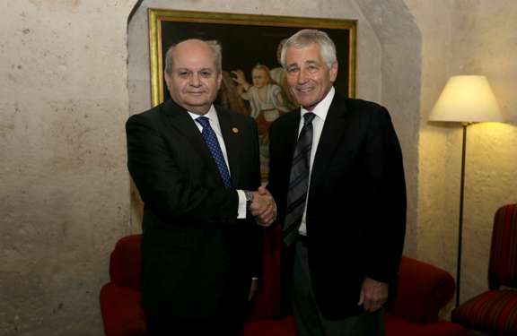 (defensa.com) En el marco de la XI Conferencia de Ministros de Defensa de las Américas (CMDA), que se inaugura oficialmente hoy, 13 de octubre, en la ciudad de Arequipa, el Presidente de Perú, Ollanta Humala, y el Ministro de Defensa, Pedro Cateriano, sostuvieron una reunión con el Secretario de Defensa de EEUU, Chuck Hagel.