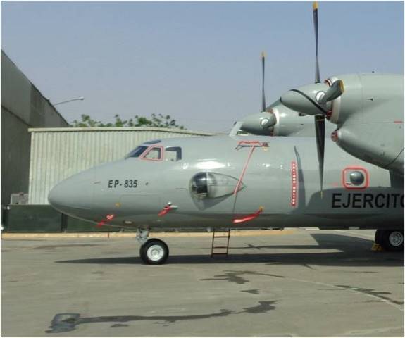El Antonov An-32B Cline es un avión de transporte medio, diseñado y fabricado en Ucrania por JSC Antonov, que tiene una longitud de 23,78 m, una envergadura de 29,20 m. y una altura de 8,75 m. Está propulsado por 2 motores Ivchenko Progress AI-20D cada uno de 5.112 hp que le brindan una velocidad máxima de 530 km/h y una de crucero de 470 km/h. El techo de operación es de 9.500 m. y el de 2.500 km. Su peso máximo al despegue es de 27.000 kg. Puede transportar 42 paracaidistas, 50 soldados o bien 24 camillas. (Alejo Marchessini, Corresponsal de Grupo Edefa en Lima).