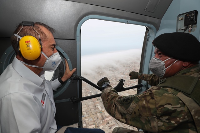 El Ministro de Defensa, Walter Martos Ruiz y el Jefe del Comando Conjunto de las Fuerzas Armadas, General de Ejército Cesar Astudillo Salcedo sobrevolando Lima a bordo de un Mi-171Sh-P para verificar el cumplimiento de la inmovilización social obligatoria.