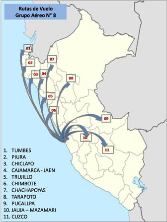 03. Desde el Grupo Aereo Nº 8, ubicado a un lado del Aeropuerto Internacional Jorge Chávez, se cubrieron rutas de vuelo a Chiclayo, Piura y Tumbes, y después a Cajamarca, Chachapoyas, Chimbote, Jaén, Tarapoto y Trujillo, así como a Cuzco, Jauja, Mazamari y Pucallpa.
