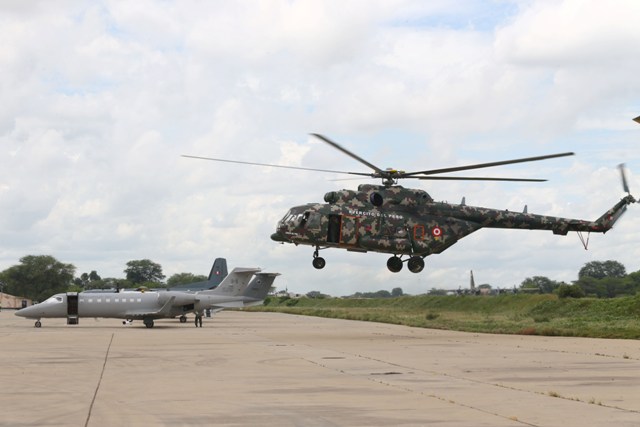 05. Un Mi-171Sh-P de la Aviacion del Ejercito, operado por pilotos de la Fuerza Aerea, se apresta a aterrizar. Mas abajo, se observa al Learjet 45XR del Grupo Aereo Nº 8.