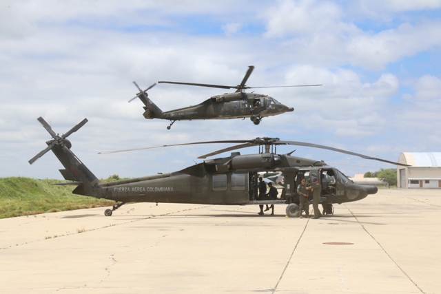 07. Un MH-60L Black Hawk de la Fuerza Aerea Colombiana, configurado como ambulancia y denominado Angel 1, emprende el vuelo. En tierra se aprecia un UH-60L.
