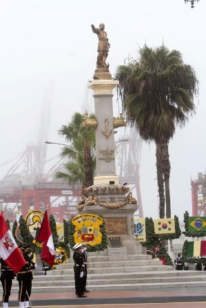 En la Plaza Grau, ubicada en El Callao, se conmemoro el 200º aniversario de la Marina de Guerra y el 142º de la heroica gesta del Gran Almirante del Perú Miguel Grau Seminario, al mando del legendario Monitor “Huáscar”, en el Combate Naval de Angamos en 1879 durante la Guerra del Pacífico. En su discurso de orden, el Almirante Alcalá Luna, tras resaltar los principales acontecimientos que marcaron el inicio de la Marina de Guerra del Perú, recordó la gesta del 8 de octubre de 1879, en Punta Angamos, manifestando que “el Gran Almirante Don Miguel Grau Seminario, heroico comandante del Monitor Huáscar, escribió con su sangre, y la de su valerosa tripulación, la más brillante página de nuestra historia naval, al ofrendar sus vidas por defender nuestra soberanía, con valentía y nobleza”.