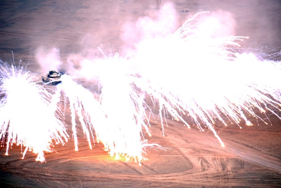 · El Sistema de Protección Activa "TShU-1 SHTORA-1" en acción. Se trata de un sistema de interferencia electróptico que además de detectar y perturbar las miras y telémetros laser, puede interferir a los misiles antitanque guiados.