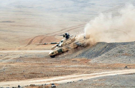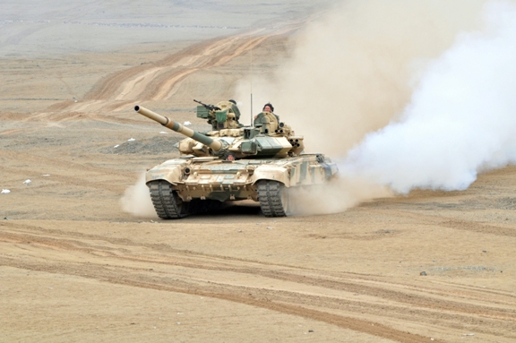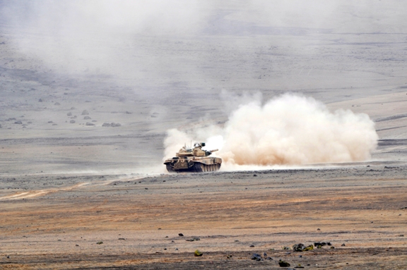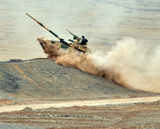 ·T-90S demostrando su potencia y movilidad desplazándose por suelo arenoso y pedregoso.