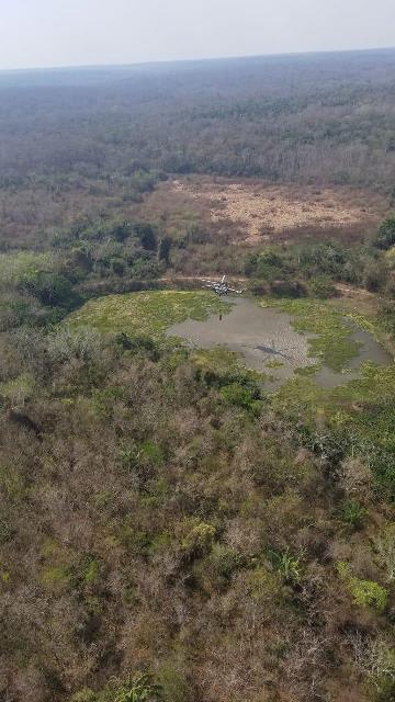 ·Mi-171Sh se apresta a recargar el Sistema Bambi Bucket en una laguna en las inmediaciones de las Llanuras de Chiquitania.