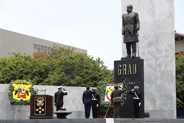 Señor Presidente de la Republica y dignas autoridades. Hoy frente a la esfinge de nuestro Gran Almirante del Perú, Don Miguel Grau Seminario, la Marina de Guerra del Perú le reitera su compromiso de servicio y vocación a la patria, teniendo siempre como norte, nuestra misión constitucional; así como continuar trabajando con profesionalismo, dedicación, lealtad, integridad y sacrificio, protegiendo siempre los sagrados intereses de la nación, tal como lo hizo nuestro Gran Almirante, Don Miguel Grau Seminario y todos los valerosos marinos que ofrendaron su vida por el país. A través de la historia hasta el día de hoy, venimos cumpliendo el sagrado deber con la patria, incluso hasta con el sacrificio de la vida como lo hiciera el Almirante Grau y valerosos marinos que, a través de los años, en el cumplimiento de su misión, nos legaron su ejemplo de honor, valor y entrega absoluta.