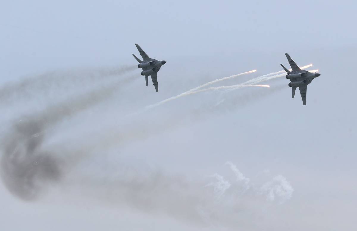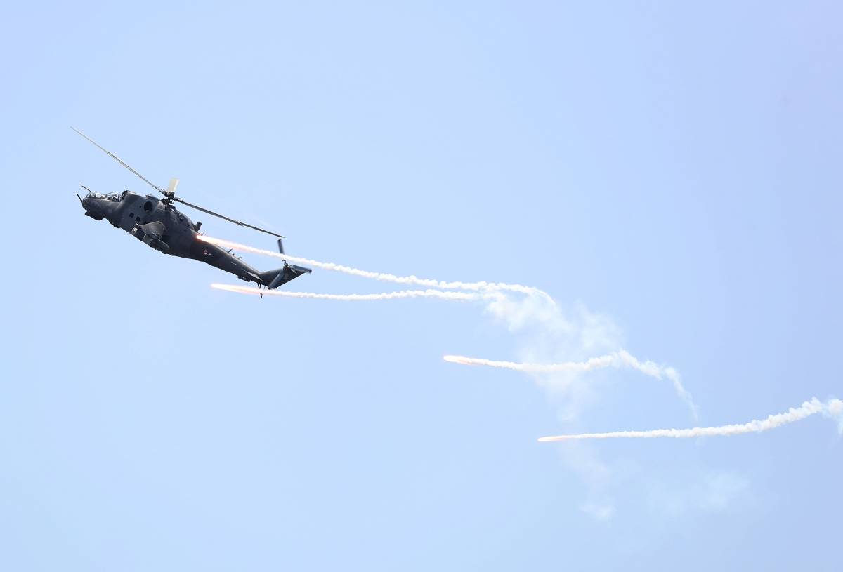 Mi-25D Hind D del Grupo Aereo N° 2 realizando una maniobra evasiva tras lanzar una salva de chaff-flares.