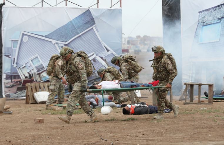 Efectivos del GRUFE en una evacuacion de heridos tras un desastre, en este caso un sismo de alta intensidad.