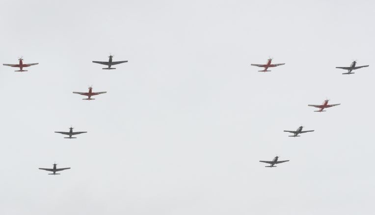 KAI KT-1P Torito en formacion alusiva al 77º Aniversario de la inmolacion del Capitan FAP Jose Quiñones Gonzales.