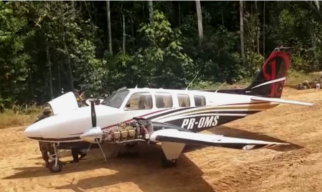 Beechcraft B58 “Baron” matriculado en Brasil como PR-OMS al momento de ser incautada a mediados de 2021 en el curso de una operacion de interdiccion contra el trafico ilicito de drogas en Loreto, en la Región Amazónica.