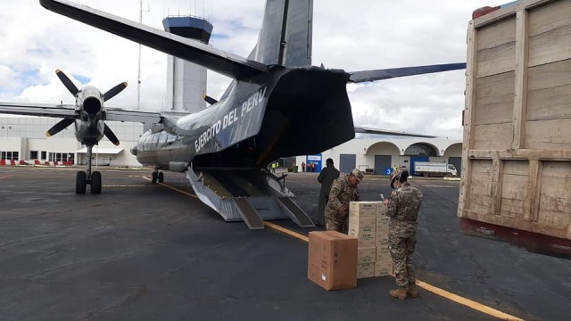 En lo que a Operaciones Aérea se refiere, las Fuerzas Armadas han realizado, entre el 17 y el 23 de marzo, unos 30 vuelos de apoyo, que representan al momento unas 110 horas de vuelo efectivo, dedicados exclusivamente al traslado de material e insumos médicos, así como muestras para ser analizadas, y transporte de personal de salud, funcionarios y pasajeros varados en Arequipa e Iquitos. La Fuerza Aérea ha desplegado de momento un Boeing 737-200, un Leonardo C-27J Spartan y un L-100-20 Hércules, así como un Learjet 36A y un 45XR. Por su parte, la Aviación del Ejercito ha movilizado un Antonov An-32B y un Beechcraft 1900D, mientras que la Aviación Naval a un Beechcraft B-200 Super King Air y un Fokker 60UTI. Otros medios, en especial las flotas de helicópteros del tipo Mi-17-1B y Mi-171Sh-P, se mantienen en alerta ante cualquier eventualidad.