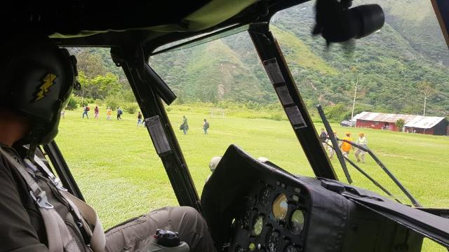 Una vista desde la cabina de un Mi-17-1B del Grupo Aereo N° 3 tras aterrizar en las inmediaciones de un poblado afectado por el sismo.
