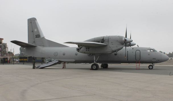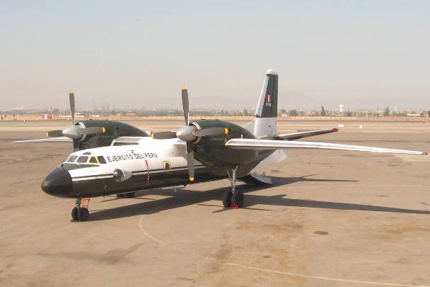 El Antonov An-32B Cline es un avión de transporte medio, diseñado y fabricado en Ucrania por Antonov JSC, que tiene una longitud de 23.78 m, una envergadura de 29.20 m. y una altura de 8.75 m. Esta propulsado por 2 motores Ivchenko Progress AI-20DM cada uno de 5,112 hp que le brindan una velocidad máxima de 530 km/h y una de crucero de 470 km/h. El techo de operación es de 9,500 m. y el de 2,500 km. Su peso máximo al despegue es de 27,000 kg. Puede transportar 42 paracaidistas, 50 soldados o bien 24 camillas. (Alejo Marchessini, Corresponsal de Grupo Edefa en Lima).