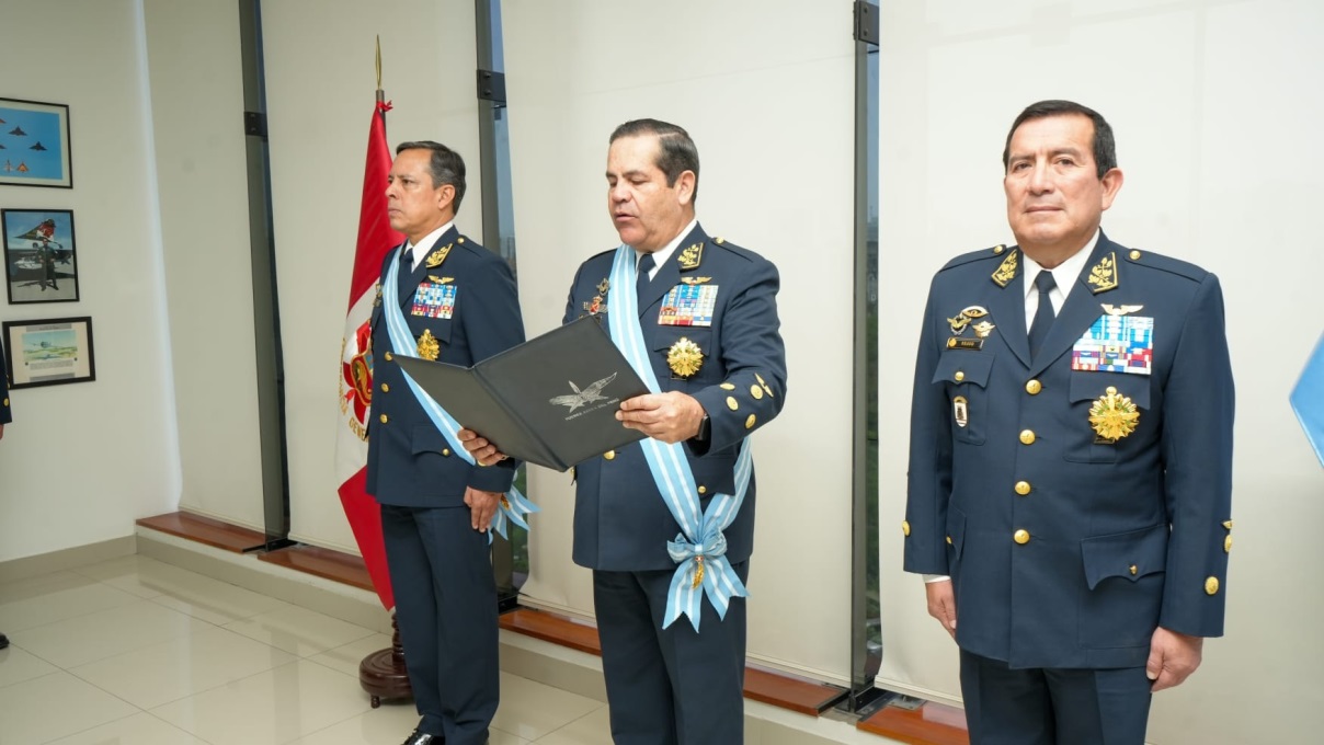 De izquierda a derecha: Teniente General Rubén Gambarini, Jefe del Estado Mayor General de la FAP, General del Aire Carlos Enrique Chávez Cateriano, Comandante General de la FAP, y Teniente General Roder Marinson Bravo Valera, Director General de Personal de la FAP.