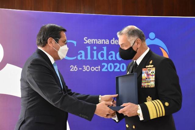 El Comandante General de la Marina, Almirante Fernando Cerdán Ruiz, recibió el reconocimiento a la institución de manos del Coordinador del Comité de Gestión de la Calidad y Presidente del Consejo Evaluador del Premio, Luis Tenorio. El Almirante Cerdán Ruiz manifestó que “el reconocimiento obtenido por la Marina de Guerra del Perú, el segundo por año consecutivo, fortalece el compromiso de la institución con la sociedad, en especial con las poblaciones más vulnerables del país”, y reitero “el compromiso de la Marina de Guerra del Perú para seguir trabajando día a día para coadyuvar al control y disminuir la propagación de la pandemia". El acto, realizado en la sede de la Sociedad Nacional de Industrias, contó con la participación del Ministro de Defensa, Gral. EP (r) Jorge Luis Chávez Cresta, la Presidenta del Instituto Nacional de la Calidad (Inacal), Clara Gálvez, y el Presidente de la SNI, Ricardo Márquez. (Alejo Marchessini, Corresponsal de Grupo Edefa en Lima).