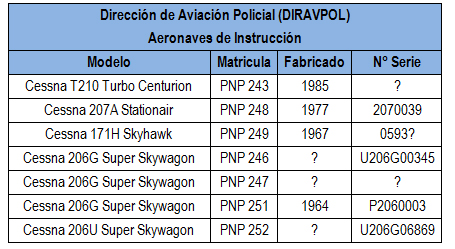 Actualmente, las misiones de instrucción y entrenamiento básico en la DIRAVPOL corren por cuenta de solo 6 aviones Cessna: un 172H Skyhawk, cuatro 206G/U y un T210 Turbo Centurion. Se trata de aeronaves incautadas durante operaciones antidrogas en la Región Amazónica que (ver cuadro adjunto) fueron entregadas en pésimas condiciones de mantenimiento, sin documentación y con historiales técnicos poco menos que desconocidos. (Alejo Marchessini, corresponsal de Grupo Edefa en Lima).