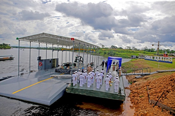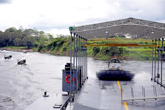 (defensa.com) El ministro de Defensa peruano, Pedro Cateriano Bellido, acompañado del comandante general de la Marina de Guerra del Perú, Almirante Carlos Tejada Mera, inauguró un hangar flotante construido por los Servicios Industriales de la Marina (SIMA-Iquitos) que servirá como plataforma de soporte y mantenimiento de los Hovercraft Griffon GH-2000 TD(M) que operan en la Amazonia, así como en el Valle de los ríos Apurímac, Ene y Mantaro (VRAEM).