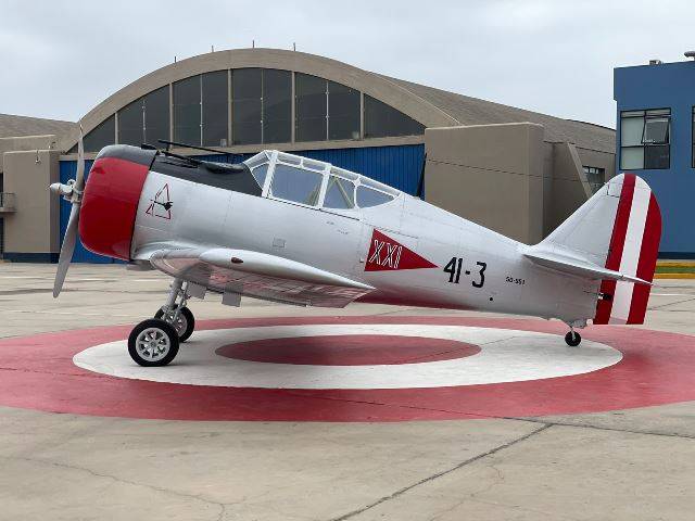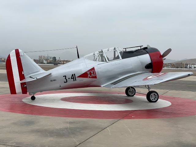 NA-50 (50-950) Torito restaurado por el SEMAN. Sus libreas de color e insignias recrean al NA-50 (50-951) de la 41° Escuadrilla de caza que volaba el Capitan Jose Quiñones Gonzales al inmolarse en Quebrada Seca, durante el Conflicto de Zarumilla, el 23 de julio de 1941.
