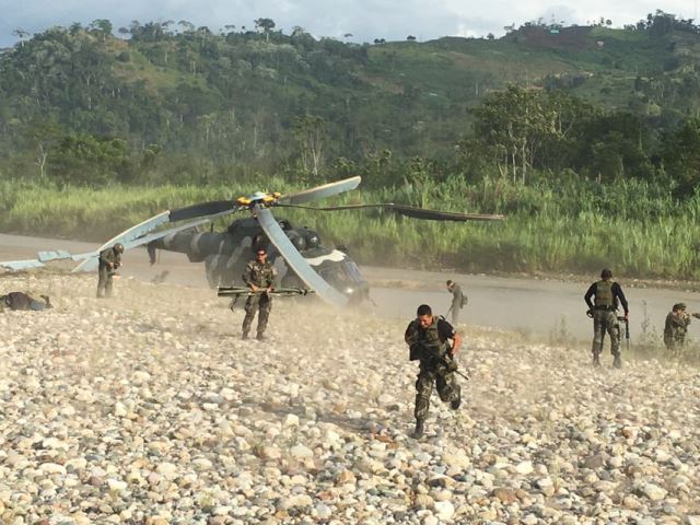 El Mi-17-1B Hip H es un helicóptero de transporte y combate que tiene una longitud aproximada de 18,4 m, una altura de 4,8 m. y un diámetro de rotor de 21,4 m. Está propulsado por 2 motores TV-3-117BM que le confieren una velocidad máxima de 250 km/h. Su alcance es de 950 kilómetros. Su diseño le permite transportar de 25 a 32 efectivos o bien 4.000 kilos de carga. El armamento comprende ametralladoras PKM de 7,62 x 54R y cohetes S-5KO de 57 mm. (Alejo Marchessini, Corresponsal de Grupo Edefa en Lima)