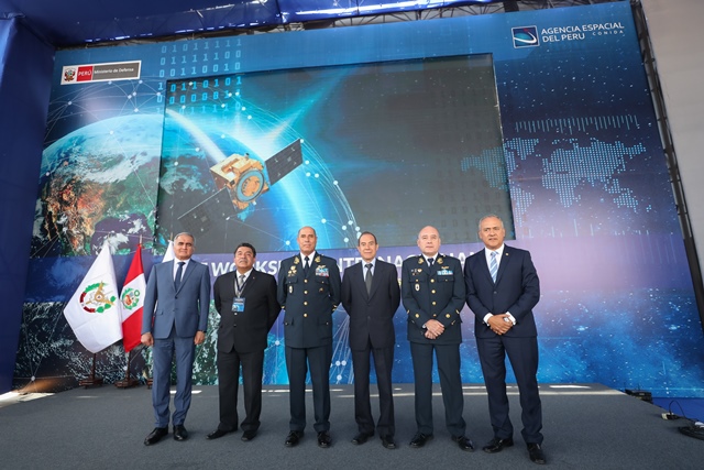 III Workshop Internacional "Peru-SAT1: Lecciones Aprendidas 2019". De izquierda a derecha: Los exJefes Institucionales de CONIDA, Mayores Generales FAP (r) Carlos Caballero Leon y Carlos Rodriguez Pajares, el Comandante General de la Fuerza Aerea: General del Aire Rodolfo Garcia Esquerre, el Ministro de Defensa: Walter Martos Ruiz, el Jefe Institucional de CONIDA: Mayor General FAP Javier Tuesta Marquez (Jefe Institucional de CONIDA) y el Viceministro de Recursos para la Defensa: Teniente General FAP (r) Javier Ramirez Guillen.