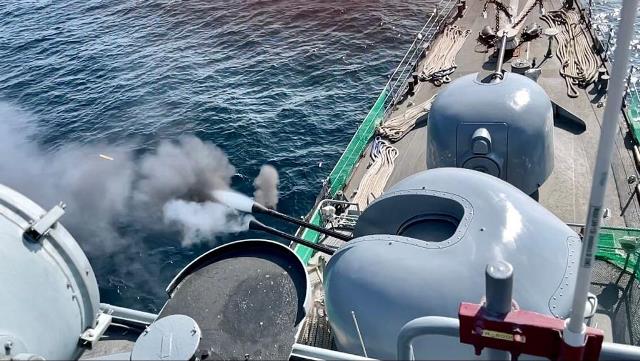 El montaje Breda-Bofors 40/L70 de 40 mm. del BAP “Guise” (CC-28) disparando una salva durante la fase de pruebas.