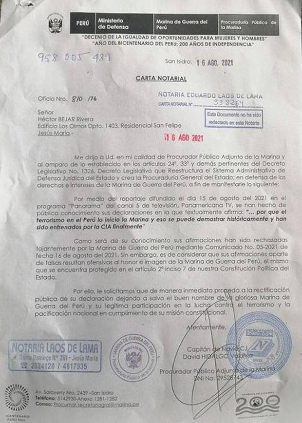 Tras la renuncia de Bejar Rivera, trascendió que un día antes, el Procurador Publico Adjunto de la Marina de Guerra, Capitán de Navío David Hidalgo Valdivia, le envió una Carta Notarial solicitándole – al amparo del Decreto Legislativo N° 1326 que restructuro el Sistema Administrativo de Defensa jurídica del Estado y crea la Procuradoría General del Estado - “la rectificación pública de su declaración dejando a salvo el buen nombre de la gloriosa Marina de Guerra del Perú y su legitima participación en la lucha contra el terrorismo y la pacificación nacional en cumplimiento de su misión constitucional”.