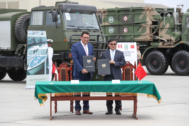 En una ceremonia realizada en el Cuartel General del Ejército, el presidente de la Republica peruana, Martín Vizcarra, acompañado del ministro de Defensa, José Huerta Torres, recibió de parte del embajador de la República Popular China, Jia Guide, una donación de poco más de 18 millones de dólares en material militar diverso. En su discurso, el presidente manifestó que las relaciones entre Perú y China de amistad y comerciales tienen muchos años, pero recientemente se han visto fortalecidas y esta donación es prueba de ello.