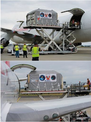 En las fotos aparece el embalaje del PeruSat-1 embarcando en Toulouse en el Boeing 747-400SF carguero de la aerolínea eslovaca Air Cargo Global que lo trasladó para su preparación de cara al lanzamiento desde Kourou.