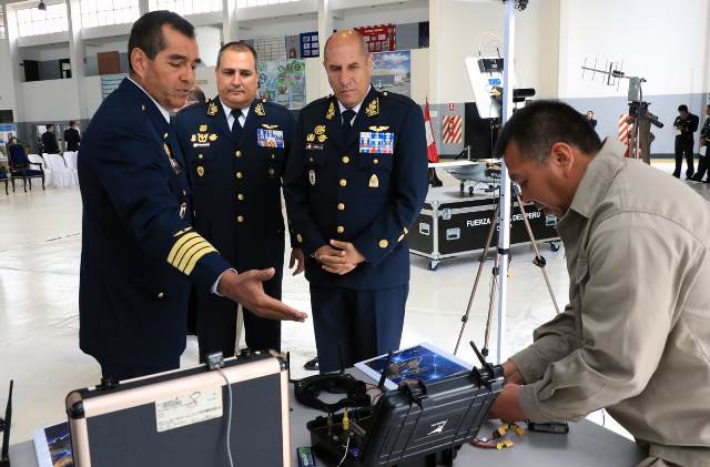 ·El coronel FAP Miquel Palomino, jefe del CIDEP, explica las bondades del UAV “Ricuk” a los tenientes generales FAP Rodolfo Garcia Esquerre (Inspector General) y Rodolfo Pereyra Cuneo (director general de Logística).