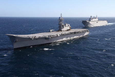 ·El “Príncipe de Asturias”, en primer plano, en su última navegación camino de El Ferrol. Detrás se ve el “Juan Carlos I”. Con la próxima baja del primero, España pierde la oportunidad de tener en todo momento un navío de proyección de su poder aeronaval (foto Armada).