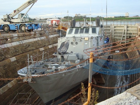 ·El antiguo patrullero “Conejera” en un dique seco de la factoría de Navantia de San Fernando (Cádiz), donde se está modernizando para su nuevo dueño Mozambique, que lo utilizará con el nombre de “Pebane” P-001 (foto Navantia).