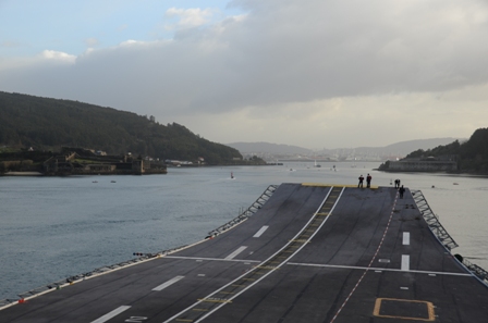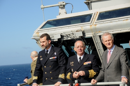 ·El Príncipe de Asturias, Felipe de Borbón, presidió la salida del navío que lleva su titulo, acompañado por el ministro de Defensa y el AJEMA, a los que podemos ver en la isla del portaaviones (foto Armada).