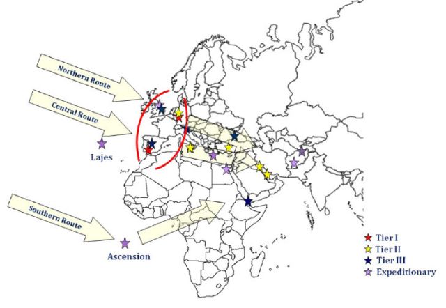 ·Gráfico del Libro Blanco sobre Estrategia de Rutas Globales del Comando de Movilidad Aérea del Pentágono, que muestra las bases más importantes en Europa e incluye a Morón.