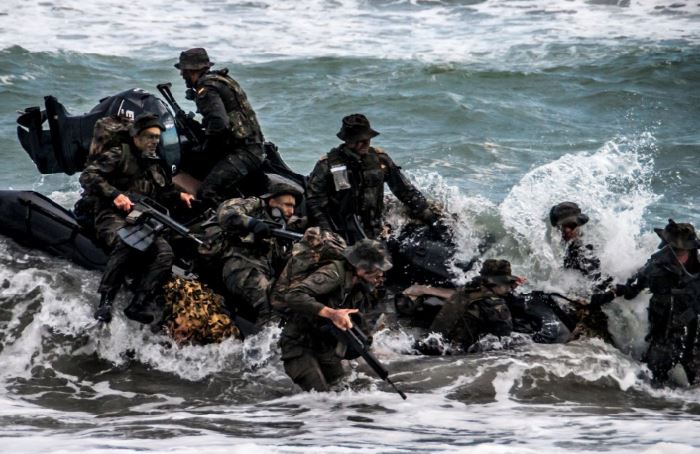 Foto: Zapadores haciendo prácticas anfibias con lanchas Zodiac “Mark III” equipadas con fuera borda Envirude de 55 CV (BZAP, Almería, 2013).