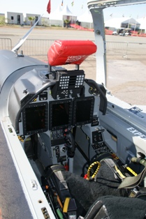 ·Detalle del "cockpit" del T-6C “Texan-II”, en el que se pueden apreciar sus pantallas multifunción y el HUD, protegido con una funda roja (foto Julio Maíz).
