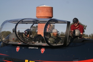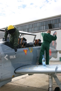 ·Un piloto marroquí, delante, recibe las últimas instrucciones antes de iniciar un vuelo en un T-6C, estando en el asiento trasero el piloto de demostración de Hawker Beechcraft (foto Julio Maíz).