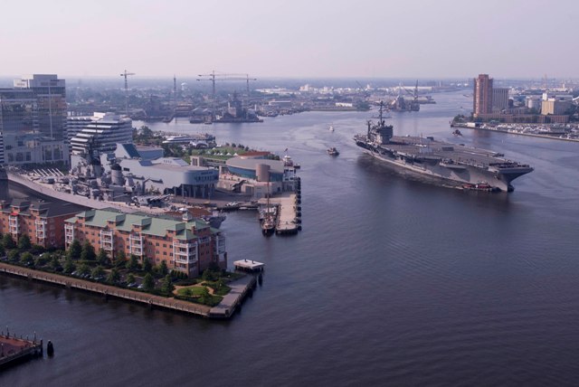Foto: El portaviones estadounidense USS “Harry S. Truman” (CVN-75) pasa al lado del acorazado USS Wisconsin (BB-64) en la base naval de Norfolk (foto US Navy).