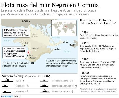 El 21 de abril de 2010, un nuevo acuerdo, esta vez entre Putin y el depuesto Yanukovich, ampliaba el plazo 25 años, hasta 2042, con la posibilidad de una extensión de 5 adicionales, a cambio de una sustanciosa reducción del 30 por ciento en el precio del gas ruso en el siguiente decenio. Es de destacar que el Gobierno de Georgia, cuyo puerto de Poti había sido la base de 32 buques de la Flota Soviética del Mar Negro, reclamó igualmente su parte en el reparto de buques, sin que Moscú atendiese a sus demandas, si bien algo más tarde Kiev transfirió algunos patrulleros a la incipiente Marina georgiana.