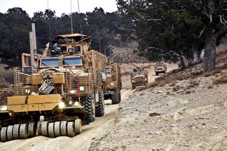 ·Un convoy de MRAP con el vehículo frontal equipado contra IED en junio de este año en Afganistán (foto US Army).