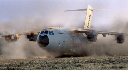En mayo de 2012, el A400M comenzó las primeras pruebas de aterrizaje y despegue en pistas no preparadas en el aeródromo de Cottbus-Drewitz (Alemania). Dotado de 12 ruedas en el tren para reducir la presión sobre el suelo y una eficiente absorción de golpes en el fuselaje por objetos como grava o piedras, será capaz de operar en pistas cortas y mal pavimentadas, incluso lo que podríamos denominar como arcillosas y con limitado espacio para maniobras en tierra. Los amortiguadores han sido diseñados también para mantener una mínima distancia al suelo, independientemente de la carga.