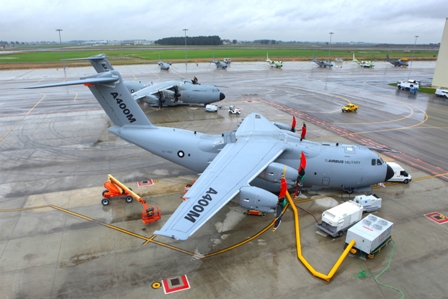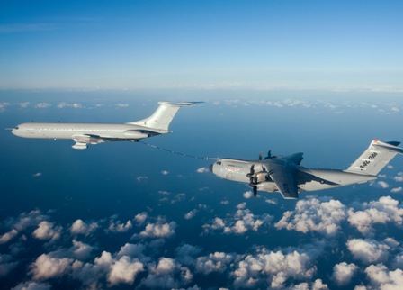 En octubre de 2012, Airbus Military realizó también con éxito un simulacro de reabastecimiento en el aire del A400M desde un avión cisterna Transall C-160 de la Fuerza Aérea francesa, realizando hasta 20 contactos secos representativos de una operación normal de combustible. Está previsto que los húmedos se lleven a cabo en el primer trimestre de 2013. Tendrá capacidad de reabastecer en vuelo tanto a aviones como helicópteros, debido a que, al tener motores turbohélices, podrá volar mucho más lento que su equivalente con turbofan. El sistema de manguera y canasta puede alimentar dos aviones simultáneamente con hasta 1.200 kg/min., mientras que la central, montada sobre un pallet, proporcionará hasta 1.800. El control de la operación se realiza con la ayuda de cámaras de video, cuya imagen se integra en las pantallas de la cabina de pilotaje. La envolvente abarca de 105 a 300 nudos y hasta 25.000 pies de altura, por lo que se pueden reabastecer en vuelo helicópteros, cazas y aviones pesados. Por ello también se han realizado hasta 30 contactos con el sistema de cesta y manguera del A330 MRTT (Multi Role Tanker Transport), también desarrollado por Airbus Military, y con un VC10 de la Real Fuerza Aérea británica.
