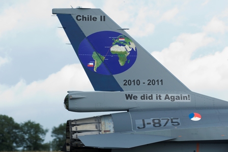 El F-16 debía realizar un touch and go (toma y al aire) antes de aterrizar y sufrir un mantenimiento en SABCA y, como resultado, otro avión fue preparado para incluirse en el último lote que debía entregarse. Todos los aviones del sexto portaban un adhesivo de Peace Amstel II, con el J-875 luciendo una pintura especial en la cola con el lema Chile II, lo hicimos de nuevo.