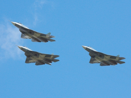 Tres cazas T-50 en vuelo (foto Alexander Pashkovskiy, Sukhoi)