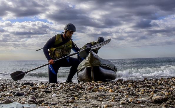 Las imágenes corresponden a una maniobra de inserción y reconocimiento efectuada el pasado mes de noviembre en las playas del Alquián, una localidad almeriense bañada por el Mediterráneo, pocos kilómetros al sur de Viator. Cada una de las Brigadas de la FUTER cuenta con capacidad de navegación para realizar misiones de reconocimiento, para lo que cuentan con lanchas semirrígidas o RHIB (Rigid-Hulled Inflatable Boat) del modelo inflable de hasta 10 plazas, Zodiac Milpro Future Commando (FC) 470, como el que se ve transportando a seis legionarios hasta la playa, armados con sus reglamentarios fusiles de asalto Heckler & Koch (HK) G-36.
