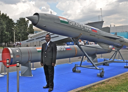 ·El máximo responsable ejecutivo de “Brahmos”, Sivathanu Pillai, con las aplicaciones navales de sus misiles (foto Yuri Laskin).