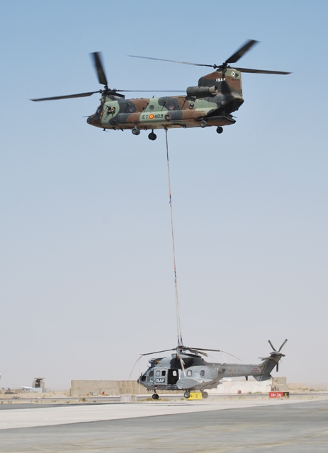 Foto: El “Chinook” del BHELTRA-V llegaba a Herat con el accidentado “Super Puma” colgando mediante una eslinga (foto BHELTRA-V).